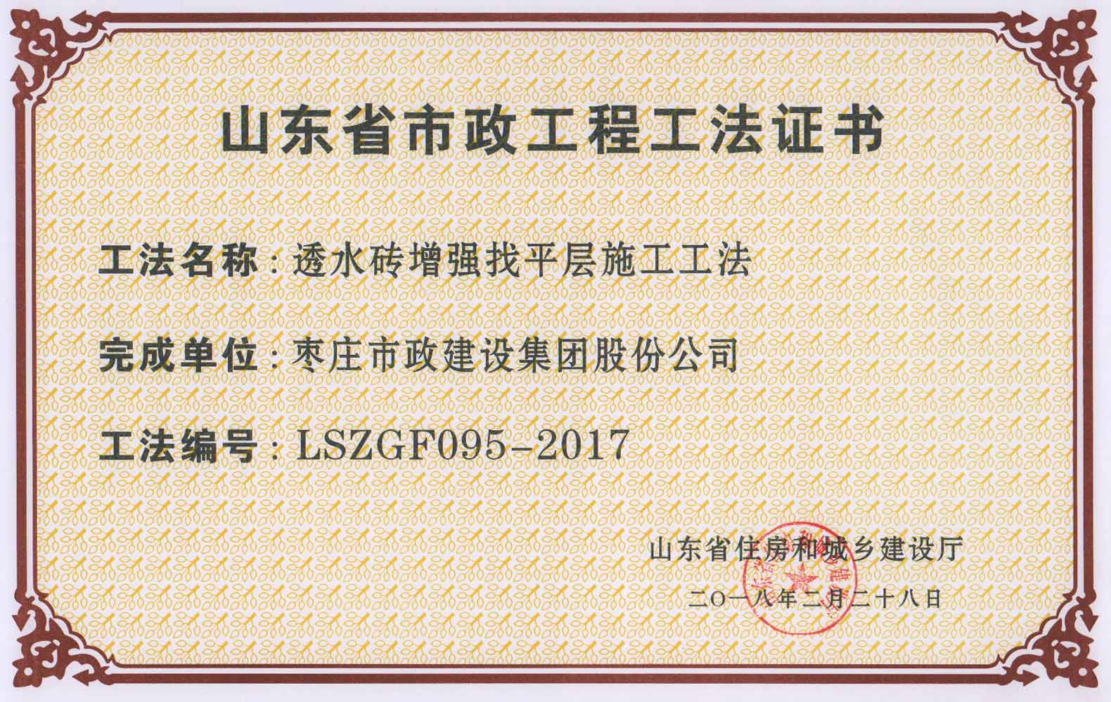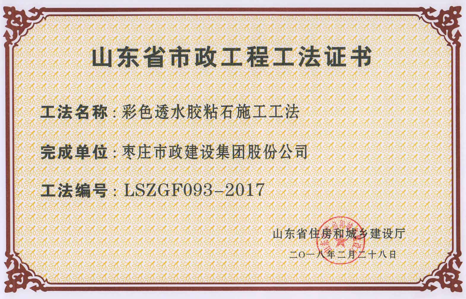 日前,由我公司編制的《彩色透水膠粘石施工工法》、《直埋電纜防盜器施工工法》、《透水磚增強(qiáng)找平層施工工法》獲評“2017年度山東省市政工程工法”。同時,我公司施工的棗莊市體育中心體育場西側(cè)室外市政工程和棗莊市市中區(qū)青檀路改造工程獲評“山東省市政基礎(chǔ)設(shè)施工程安全文明工地”。此次全省共有154個工法、160個項(xiàng)目經(jīng)過專家評審和檢查,最終分別獲得上述兩項(xiàng)榮譽(yù)。