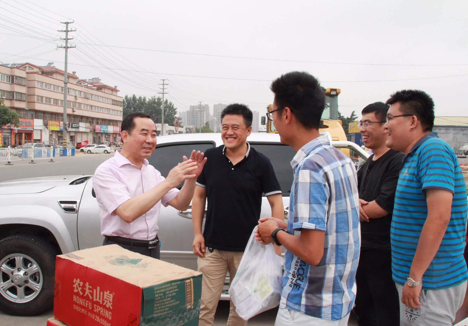 自入夏以來,高溫天氣持續(xù)不下,熱氣襲人,但公司廣大員工不畏困難,戰(zhàn)高溫、斗酷暑,依舊堅守崗位,為實現公司全年目標而奮力拼搏。7月3日,公司黨總支書記、執(zhí)行總裁夏士泉、副總裁朱新宇、工會主席鄭欣欣帶領行政部、工程部人員組成慰問組,先后趕赴青檀路改造工程、市中區(qū)復興路工程、文體中心工程等二十余項市政大中型在建工程現場,看望慰問奮斗在施工一線的廣大員工,為他們送去了防暑降溫用品,并帶去了趙峰董事長等高管的親切慰問。